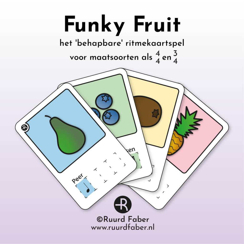 Dan bieden de ritmekaartjes een speelse en effectieve manier om met je leerlingen te werken aan leesvaardigheid, terwijl ze tegelijkertijd ritmische, auditieve en creatieve vaardigheden ontwikkelen. Als een leerling bijvoorbeeld moeite heeft met een ritmische passage in een muziekstuk, kun je de bijbehorende fruitritmes op zoeken en de leerling aan de hand van de lettergrepen van de fruitnamen laten horen hoe het ritme is opgebouwd.